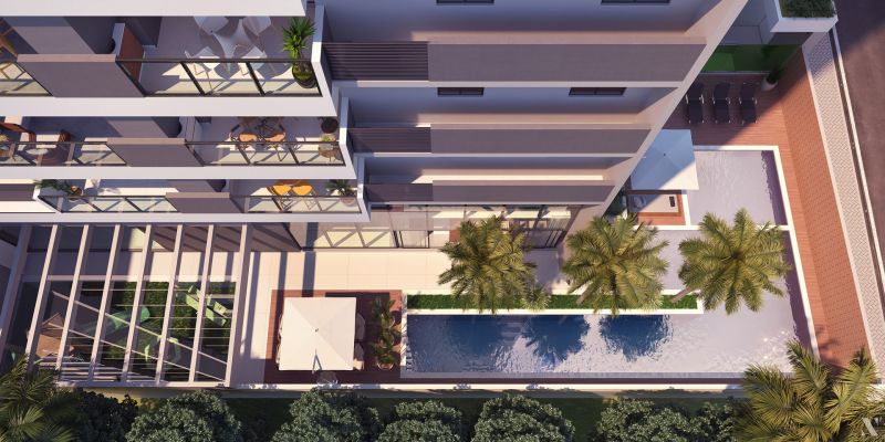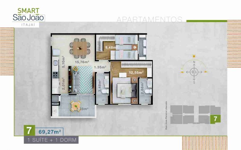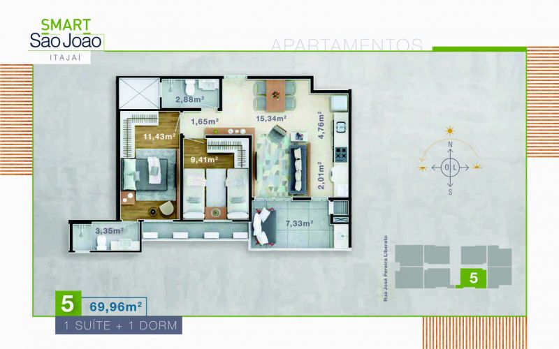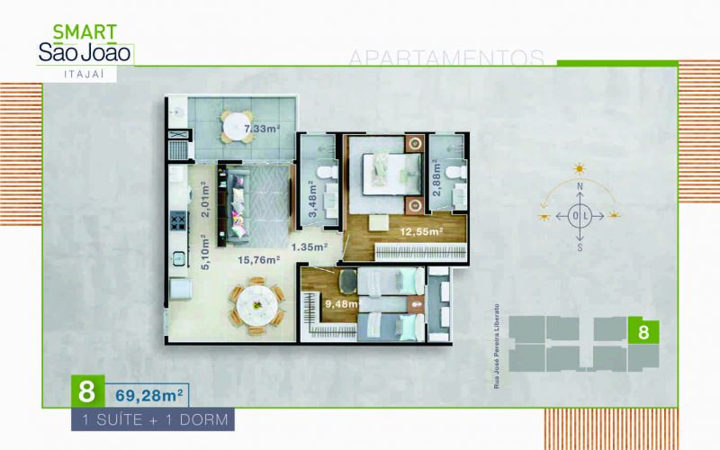 Apartamento tipo 03, 05, 07 e 08 medindo 69,96 m² de Área Privativa.