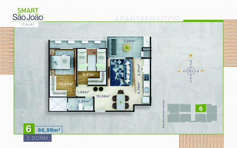 Apto tipo 04 e 06 com medidas á partir de 66,99 m² de Área Privativa.